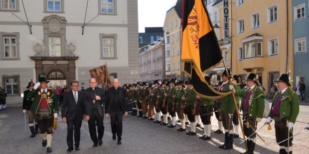 Gemeinsam mit Gastgeber Diözesanbischof Hermann Glettler und Père Henri-Marie Mottin, der geistliche Vorsitzende der Gemeinschaft Emmanuel, schritt der Landeshauptmann die Formationen der Georg-Bucher-Schützenkompanie Axams, der Musikkapelle Axams sowie zahlreicher Fahnenabordnungen der Tiroler Traditionsverbände ab.